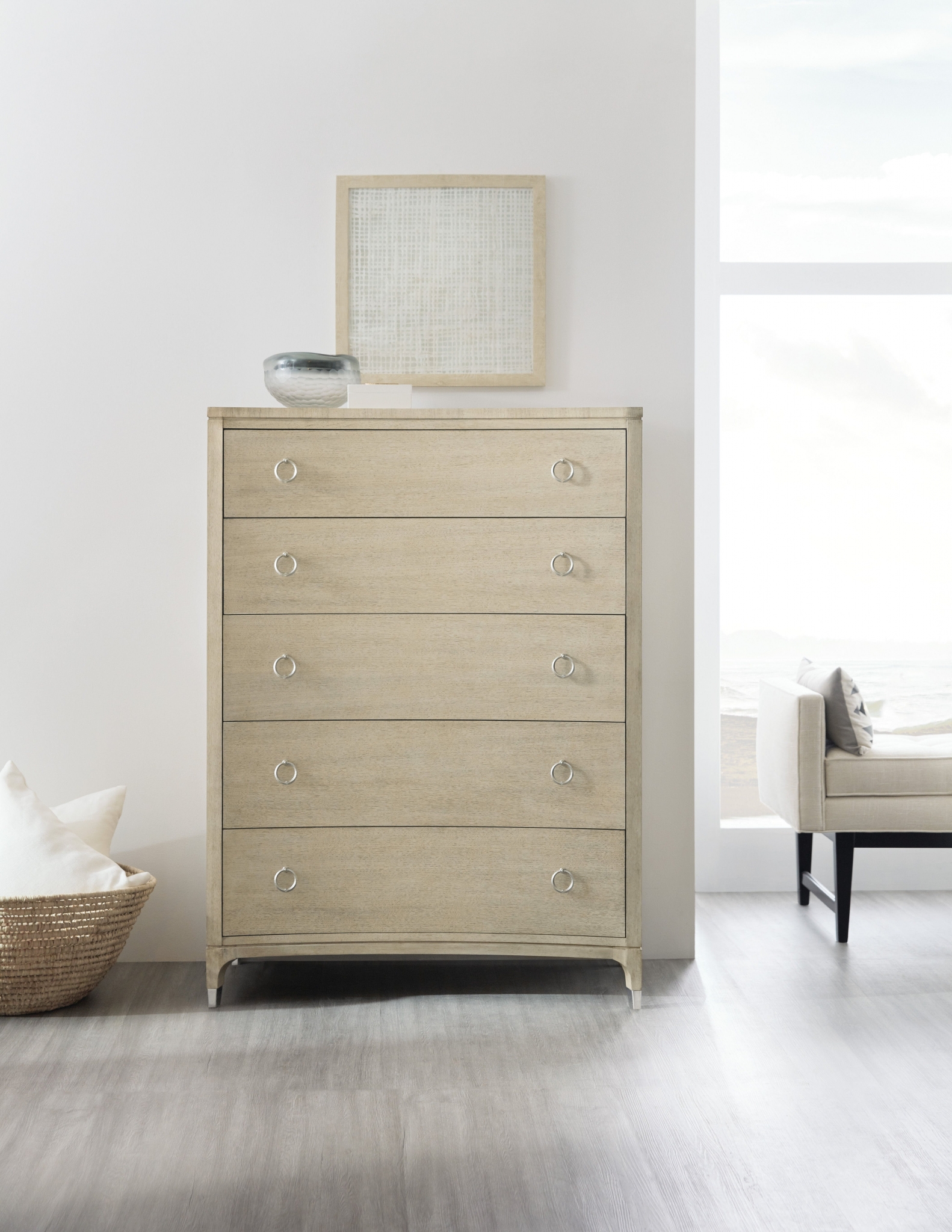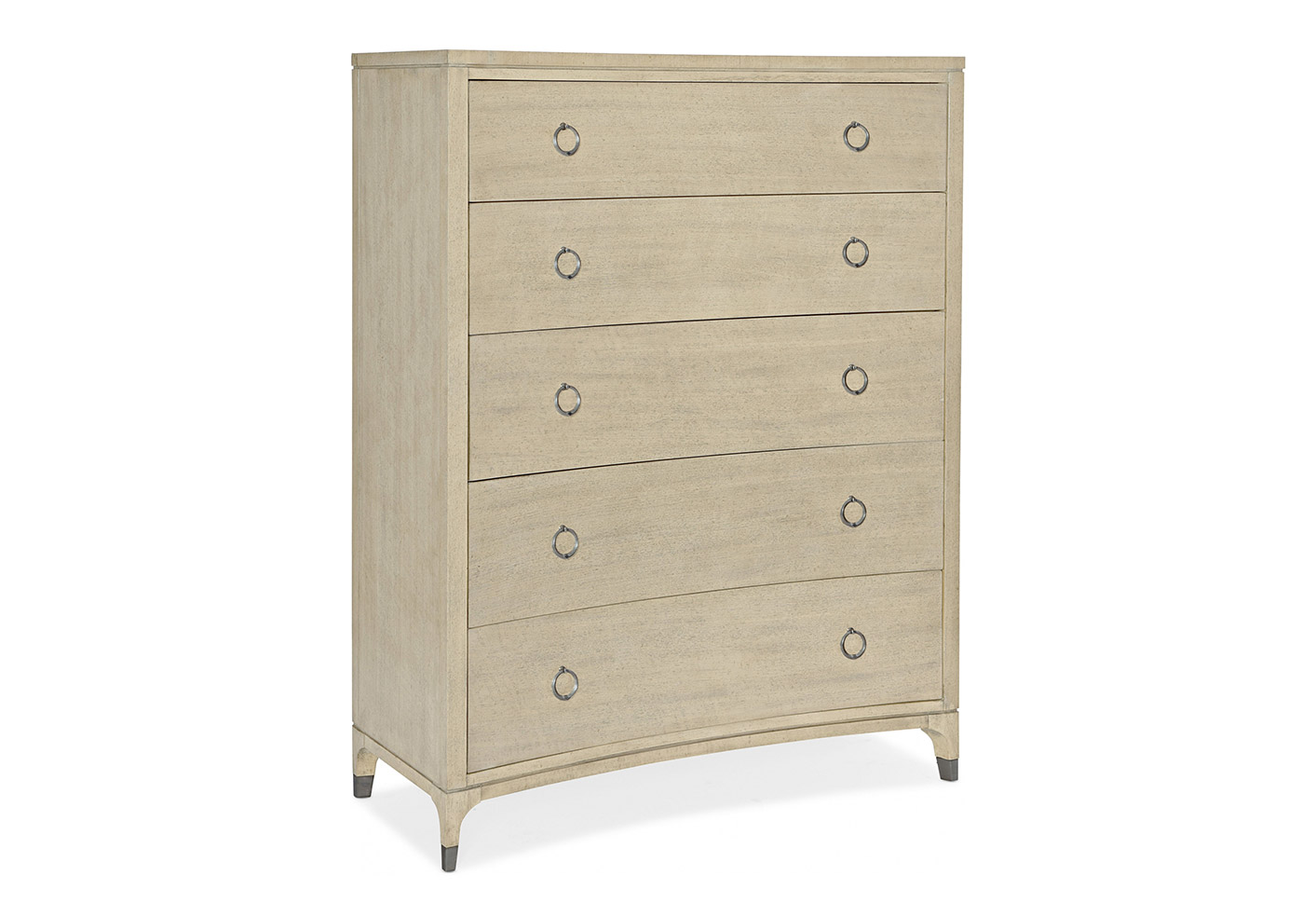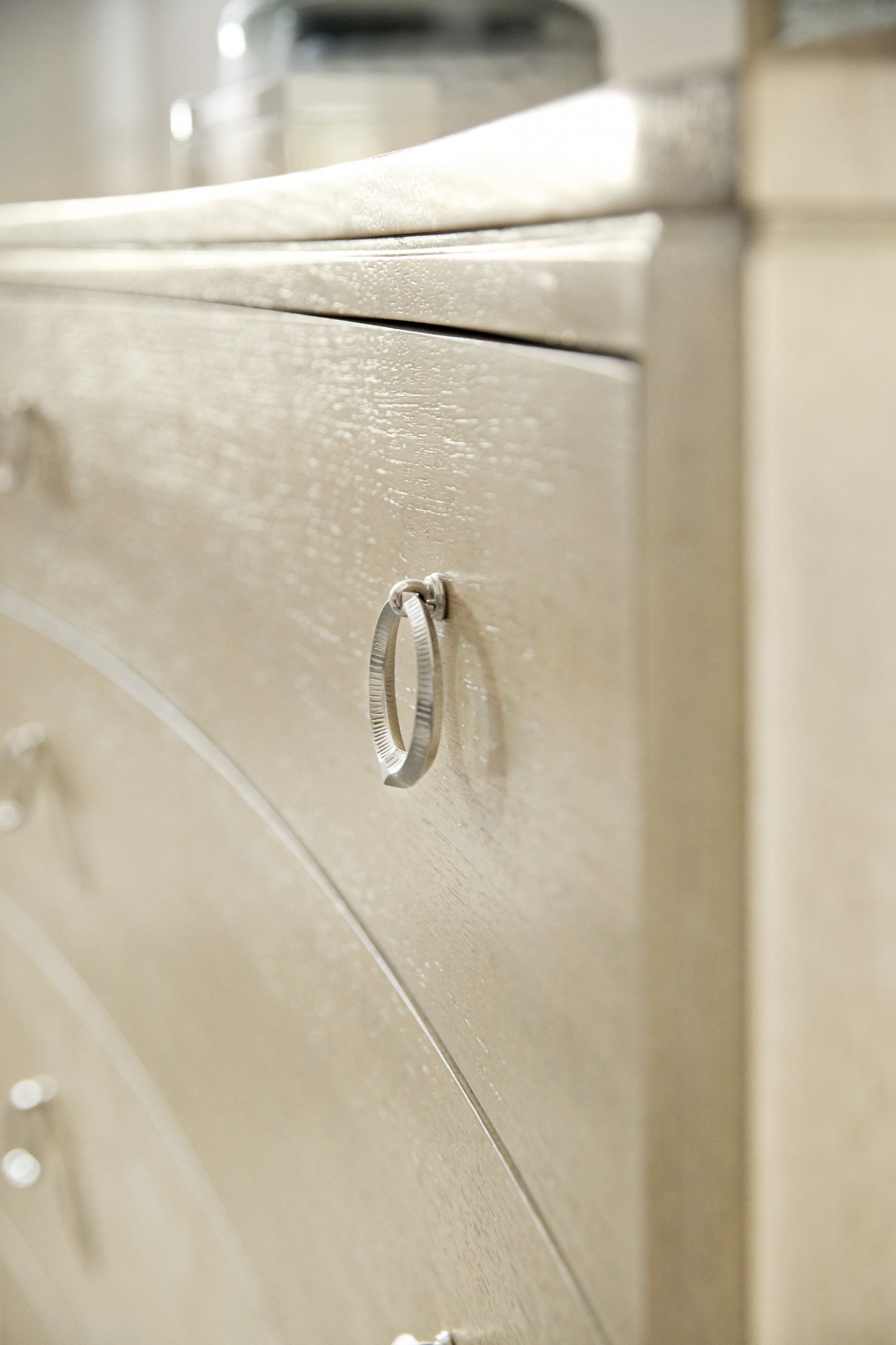 Материал изделия : Выбеленный шпон черного ореха и белого дуба с фигурными четвертями, кедр, металлические ручки и войлок внутри верхних ящиков. Финиш: Французская ваниль - цвет вспененного молока, приготовленного на пару.