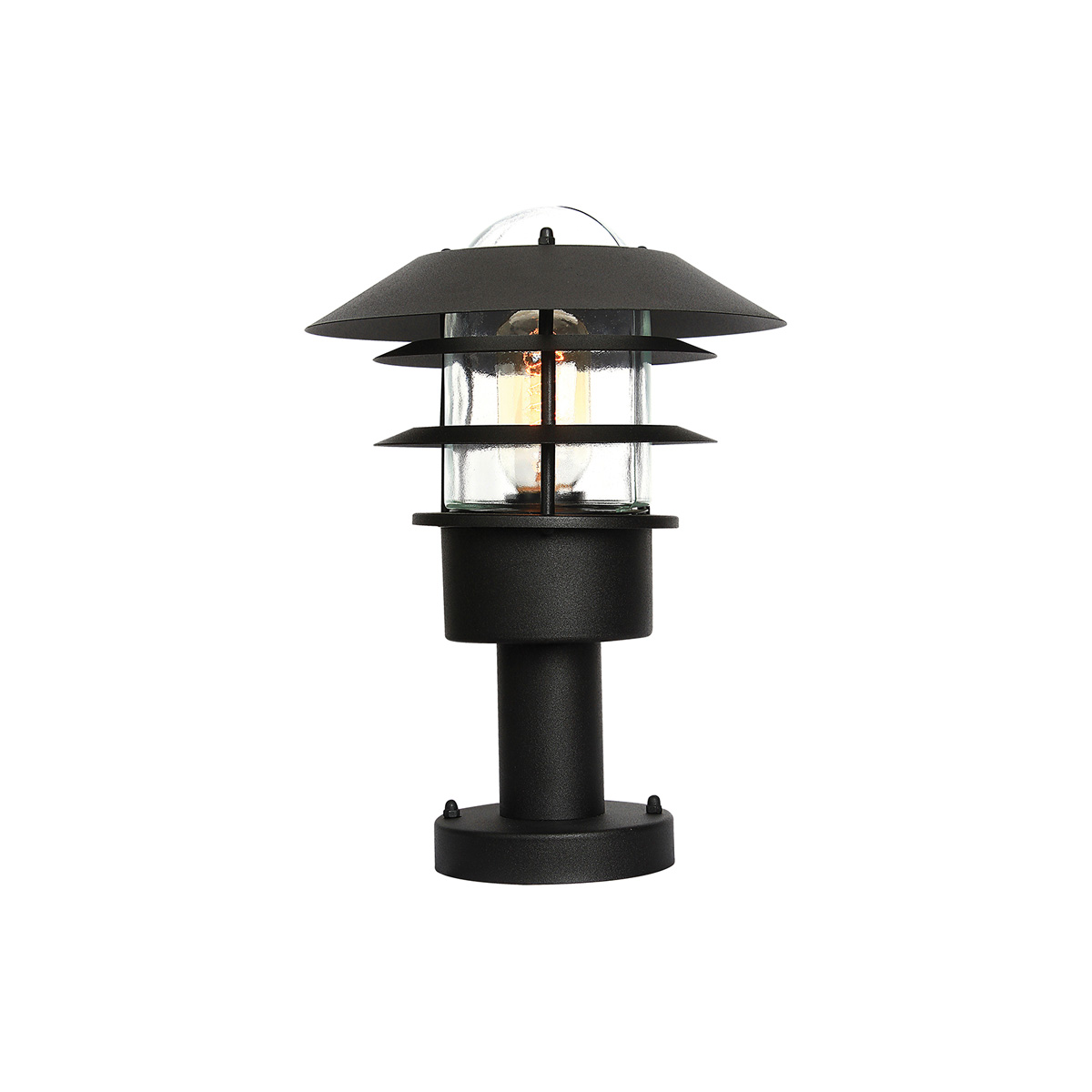 Фонарь пьедестал Elstead Lighting HELSINGOR-PED-BK. В производстве светильника используется нержавеющая сталь марки 304. Данный тип стали не подвержен коррозии в местах царапин или иных механических повреждений. Высочайшая надежность изделия подтверждена гарантией на 15 лет. Основание выполнено в цвете - Черный. Можно использовать при уличном освещении, степень защиты IP44.