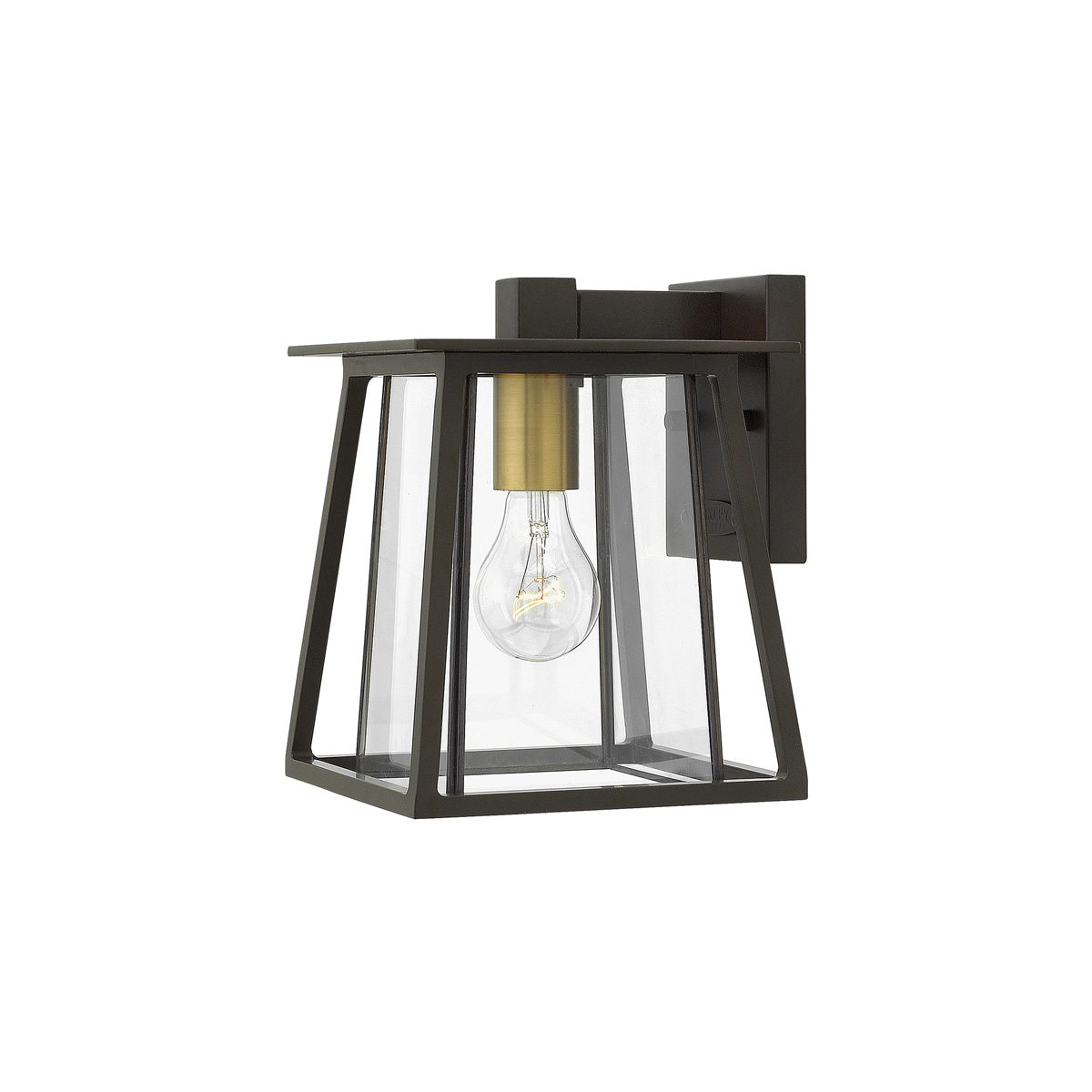 Настенный фонарь Elstead Lighting HK-WALKER2-S. Дизайн светильника корнями уходит к американскому западу с его большими, размашистыми, резкими, угловатыми контурами и деловым стилем. Прочная алюминиевая и латунная конструкция изготавливается в отделке «каштановая бронза». Внешний сварной каркас обрамляет внутренний, ограниченный прозрачным стеклом, плафон. Можно использовать при уличном освещении, степень защиты IP44.