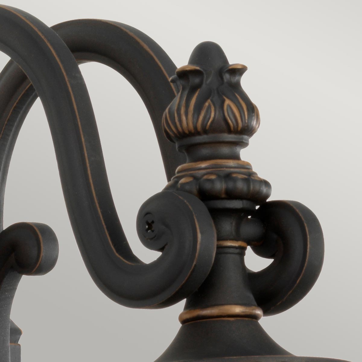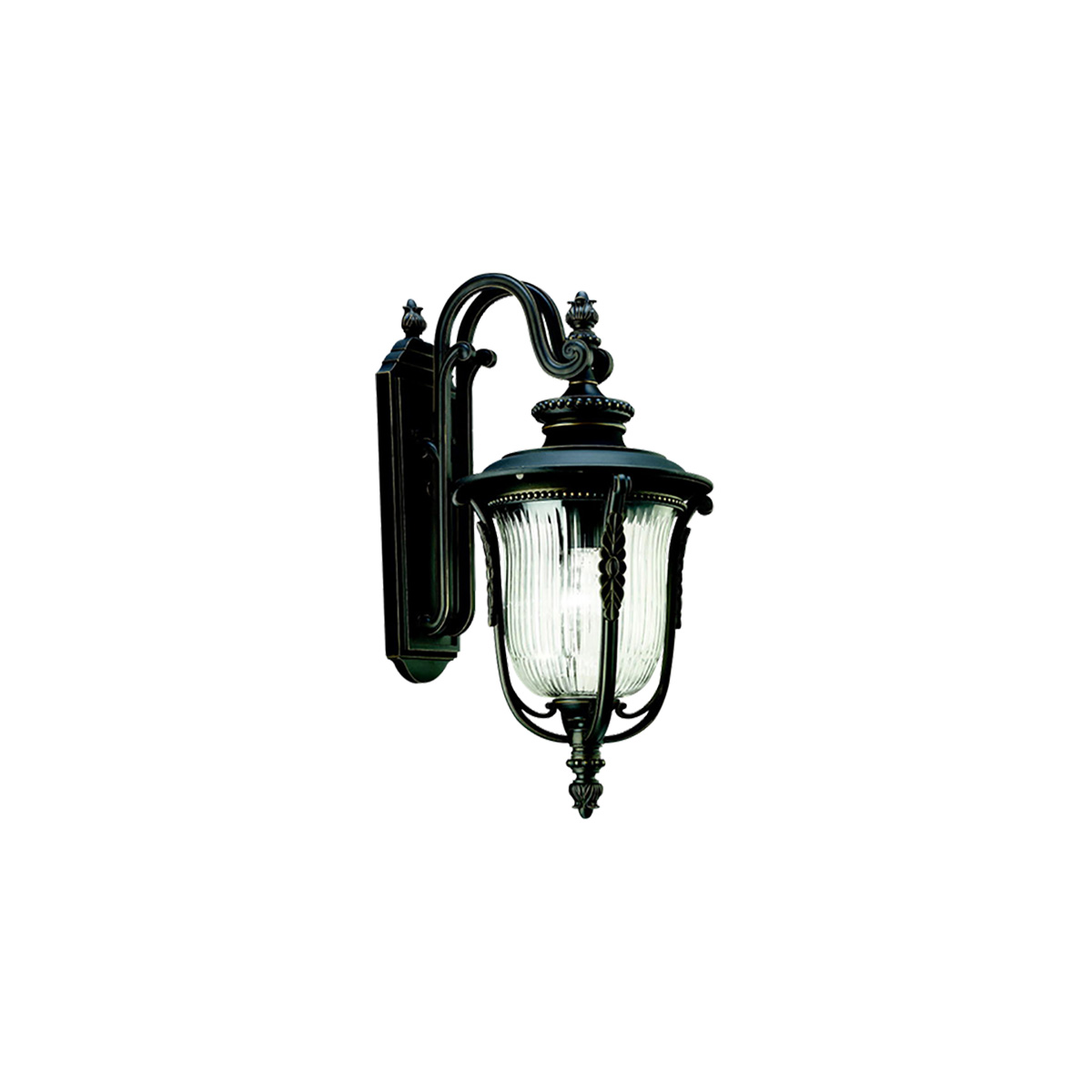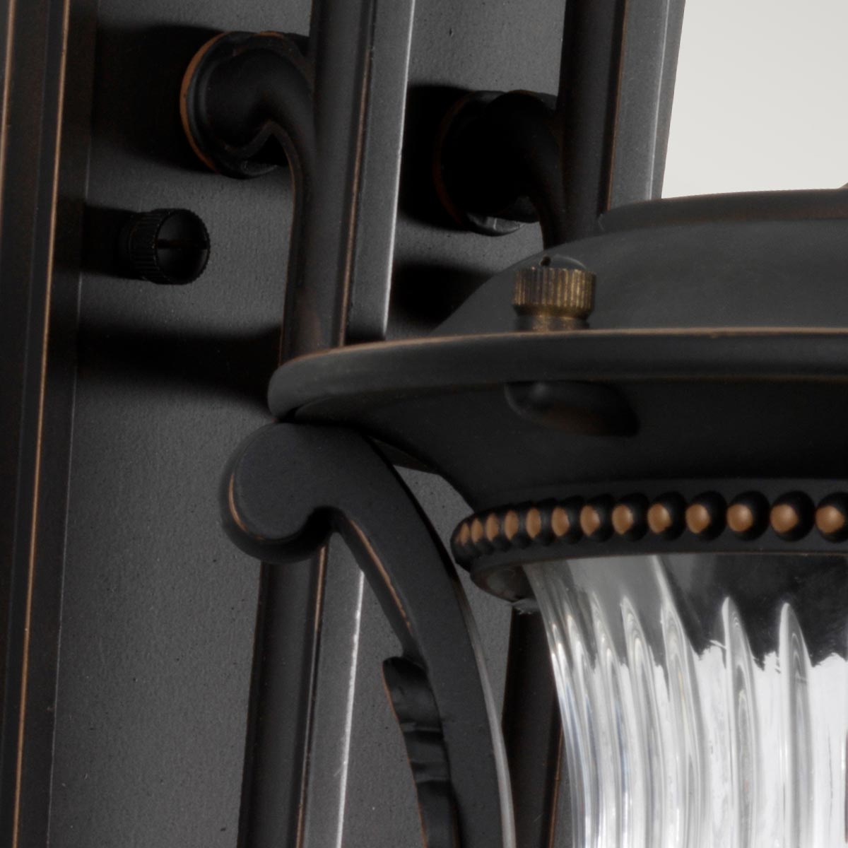 Настенный фонарь Elstead Lighting KL-LUVERNE2-M. Сочетание черной бронзы и рисунка в виде капелек, медальоны и завитки всё это делает светильник таким привлекательным. Компактно расположенные ребра на стекле создают очень комфортное для глаз освещение. Идеально подойдет для уличного освещения, степень защиты IP44.
