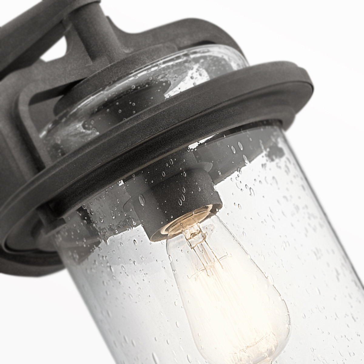 Настенный фонарь Elstead Lighting QN-ANDOVER-M. В дизайне использованы популярные сегодня винтажные зажимные скобы, неотъемлемый атрибут индустриальной эпохи. Прозрачное фактурное стекло. Основание в цвете - Выветренный цинк. Идеально подойдет для уличного освещения, степень защиты IP44.