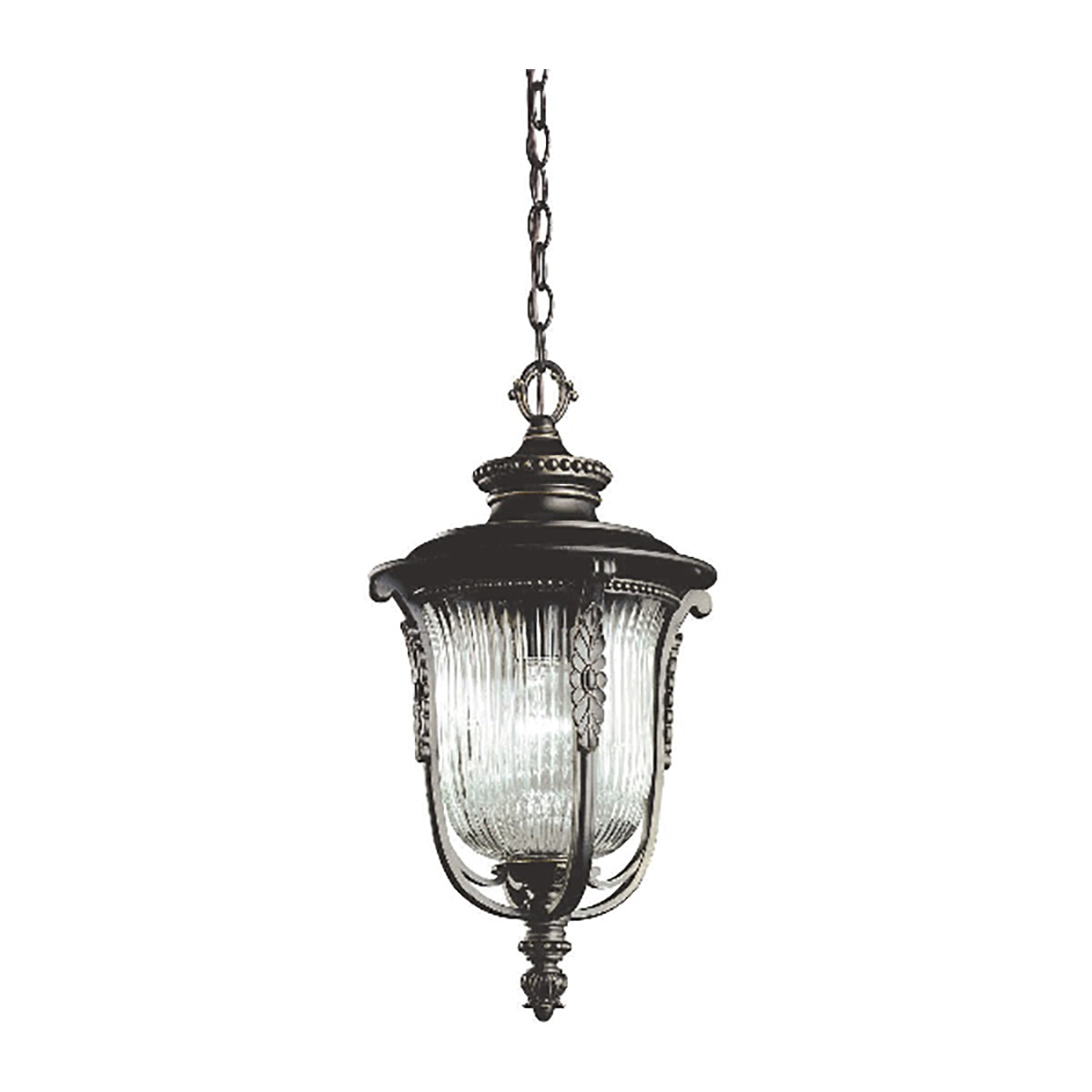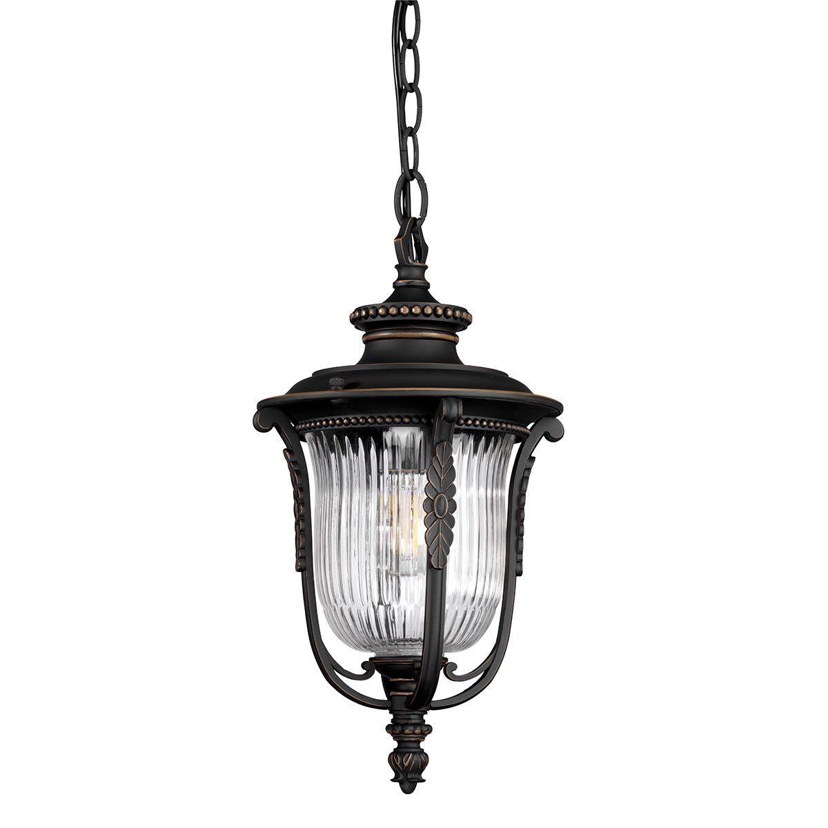 Подвесной фонарь Elstead Lighting KL-LUVERNE8-M. Сочетание черной бронзы и рисунка в виде капелек, медальоны и завитки всё это делает светильник таким привлекательным. Компактно расположенные ребра на стекле создают очень комфортное для глаз освещение. Идеально подойдет для уличного освещения, степень защиты IP23. Поставляется с цепью длиной 1200 мм