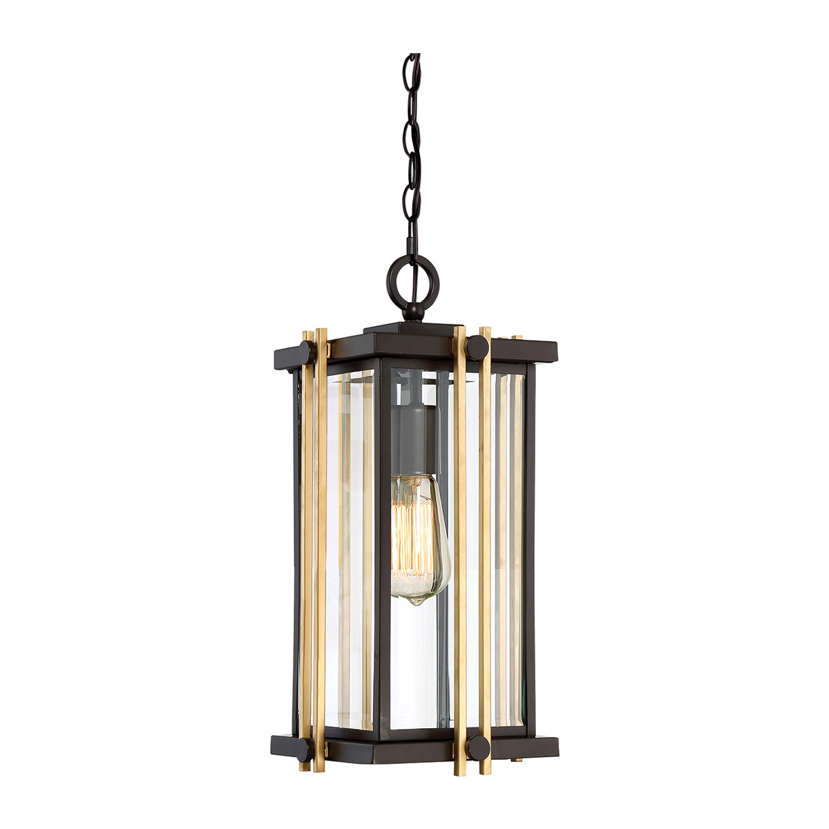 Подвесной фонарь Elstead Lighting QZ-GOLDENROD8-M. Стиль модерн в вашем доме! сочетает классические линии и новые оригинальные элементы. Дорогая отделка «западная бронза» оттеняется вертикальными стержнями, выполненными в отделке «золото». Светильник дополнен плафоном из прозрачных стеклянных панелей. Чтобы сохранить классический стиль светильника, достаточно отсоединить съемные золотые стержни. Можно использовать при уличном освещении, степень защиты IP23. Поставляется с цепью длиной 2438 мм